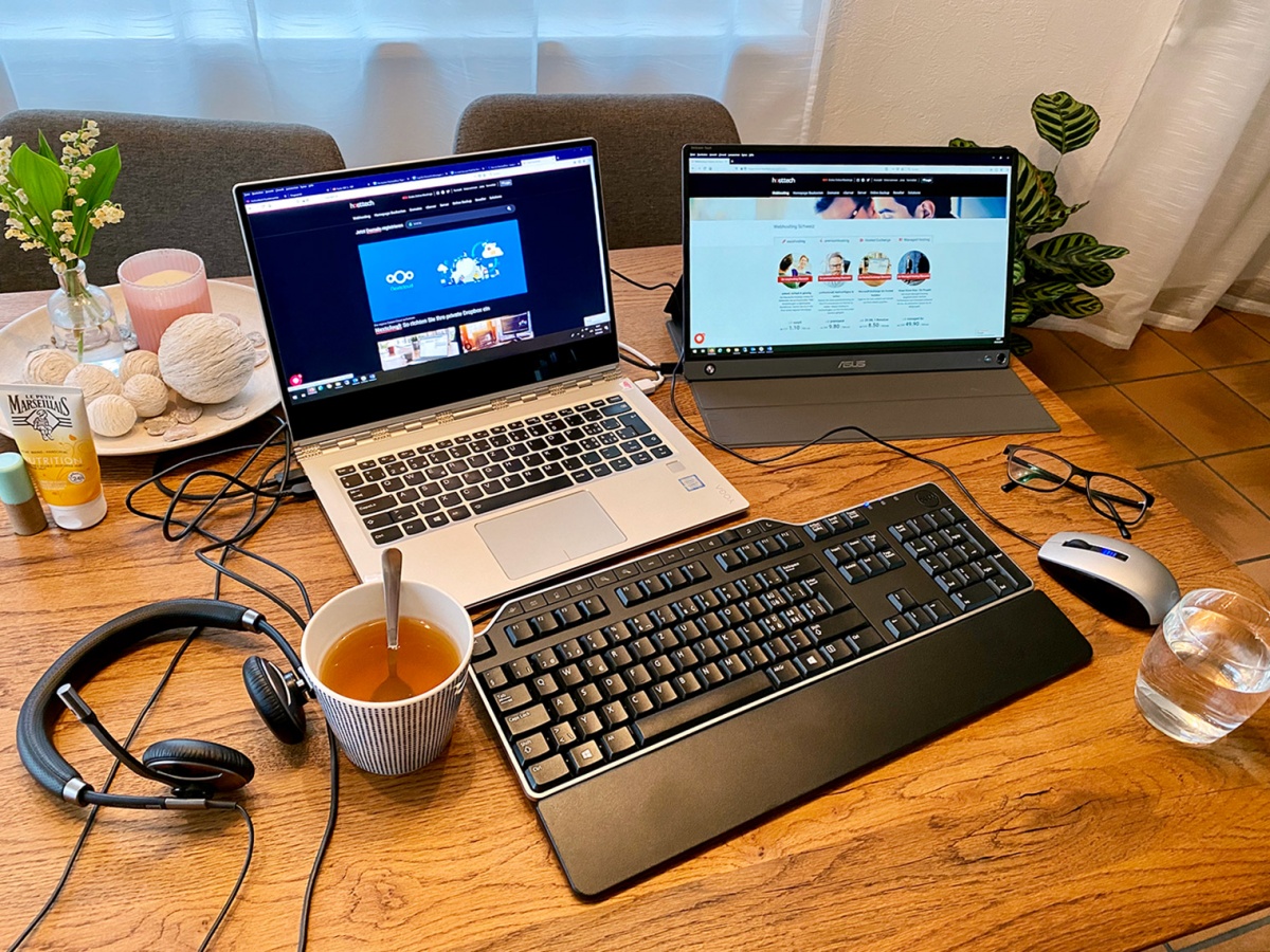 Problematisch wurde es mit der Zeit bei denjenigen Mitarbeitenden, welche zu Hause über nur wenig Platz für eine «Office-Lösung» im eigentlichen Sinne hatten. Oft wurde dann am Küchen- oder Esstisch die Laptop-Lösung zum Problem, da es kein komfortables arbeiten über längere Zeit ermöglicht. Aber auch hier haben wir schnell reagiert: Kurzerhand haben wir die für uns passende Lösung gefunden: den portablen Monitor «ASUS ZenScreen Touch».